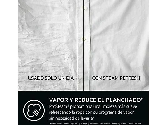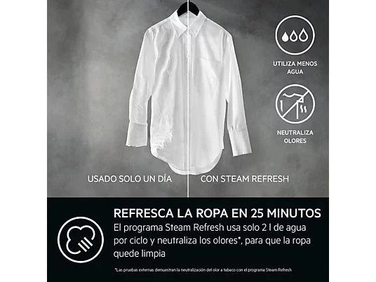 Neutraliza los olores y reduce las arrugas Con el programa Stream Refresh podrás refrescar tu ropa sin necesidad de lavarla en tan solo 25 min y consumiendo solo 2 l de agua por ciclo.